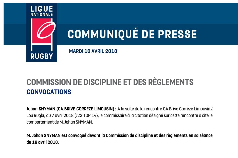 Convoqué devant la commission pour la séance du 18 avril, Johan Snyman peut néanmoins joué ce samedi à Oyonnax.