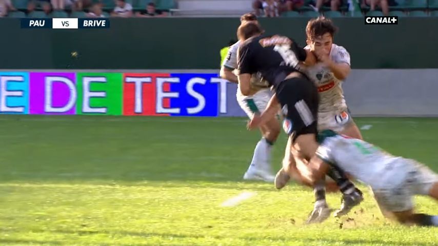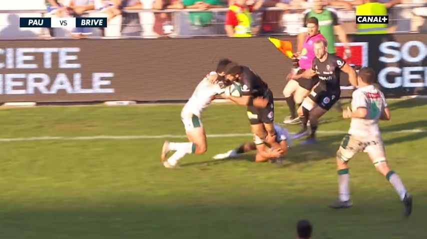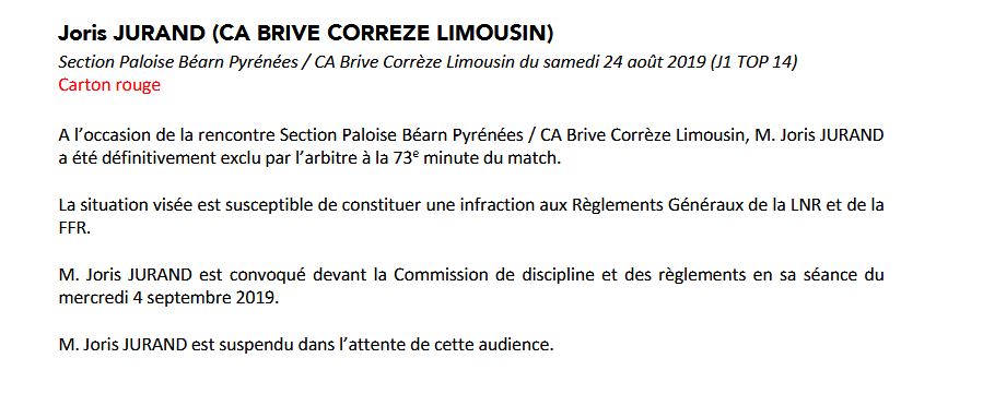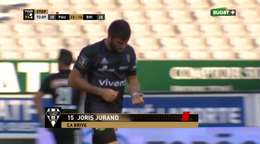Brive est en supériorité numérique depuis la 20e minute, sans vraiment en profiter, et est mené sur le score de 23-14 avec l'essai de Richard Fourcade. Quelques minutes plus tard, Joris Jurand relance et subit un double plaquage palois. Sauf que sur l'action, Atila Septar est KO. En fait, il subit un tête contre tête avec l'arrière briviste. Après l'évacuation sur civière du palois, les arbitres regardent l'action à la vidéo. Au moment de percuter Septar, Jurand pose son bras dans la zone du cou de l'ailier de Pau. Compte tenu des directives reçues par les arbitres, ce geste est sanctionné d'un carton rouge.