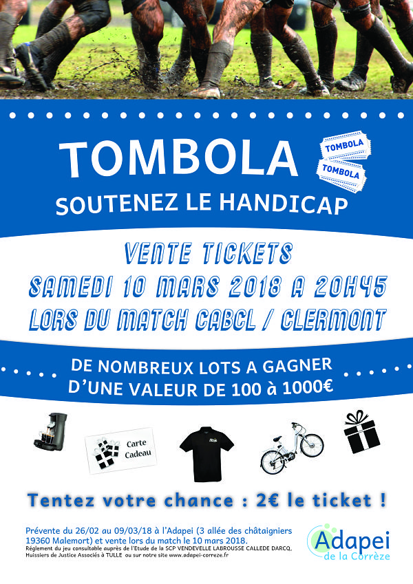 L'ADAPEI de la Corrèze organise une tombola pour continuer à se développer. À cette occasion, lors du Derby CAB/ASM, des bénévoles de l'association vendront des tickets dans l'enceinte du stade. L'esprit rugby, c'est l'amitié et la solidarité, le combat et la volonté de se dépasser. Le monde du handicap est habité par ces mêmes valeurs. Le CAB et les supporters ont déjà montré leur soutien en aidant l'ancien pilier du CAB Alexandre Barozzi qui a subi une grave blessure qui a entrainé une tétraplégie. Nous ne doutons pas que vous saurez faire un geste à l'occasion de ce derby au combien décisif.