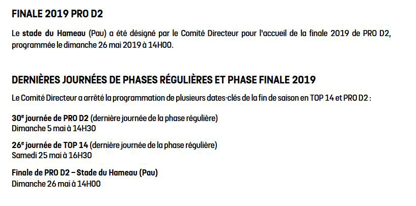 En ce qui concerne le lieu de la finale de la Pro D2, le stade retenu est le stade du Hameau à Pau pour cette finale qui aura lieu le dimanche 26 mai à 14h.