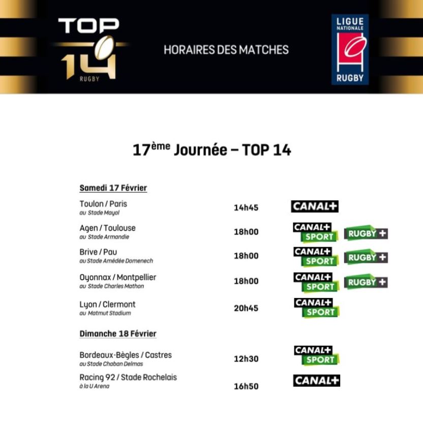Pour la 17e journée, Brive recevra Pau. La rencontre aura lieu le samedi 17 février à 18h et sera diffusée sur Canal+Sport (et Rugby+).