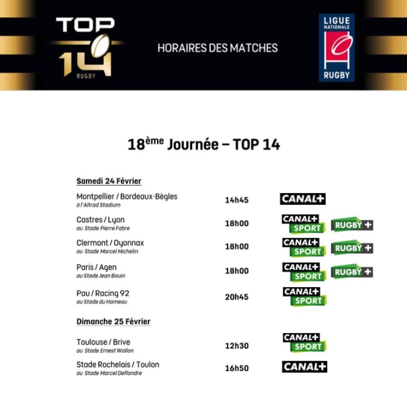 Pour la 18e journée, Brive ira à Toulouse. La rencontre aura lieu le dimanche 25 février à 12h30 et sera diffusée sur Canal+Sport.