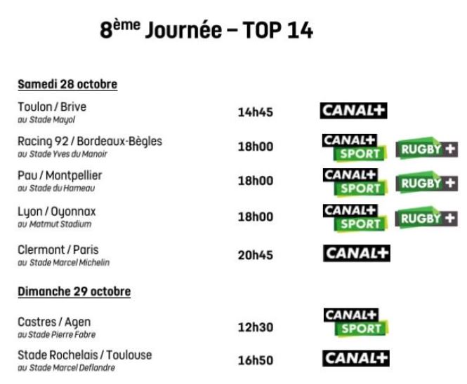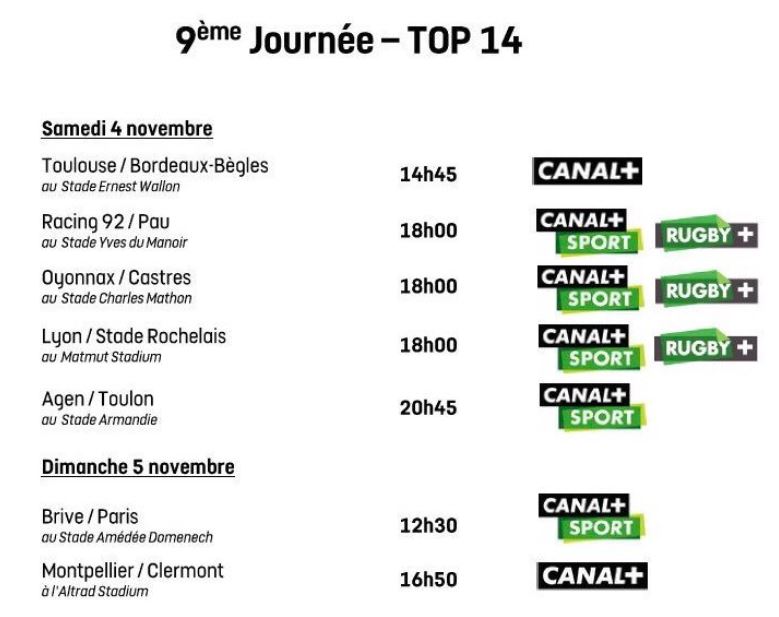 Lors de la neuvième journée, Brive recevra le Stade Français. La rencontre est programmée le dimanche 5 novembre à 12h30 sur les antennes de Canal+Sport.