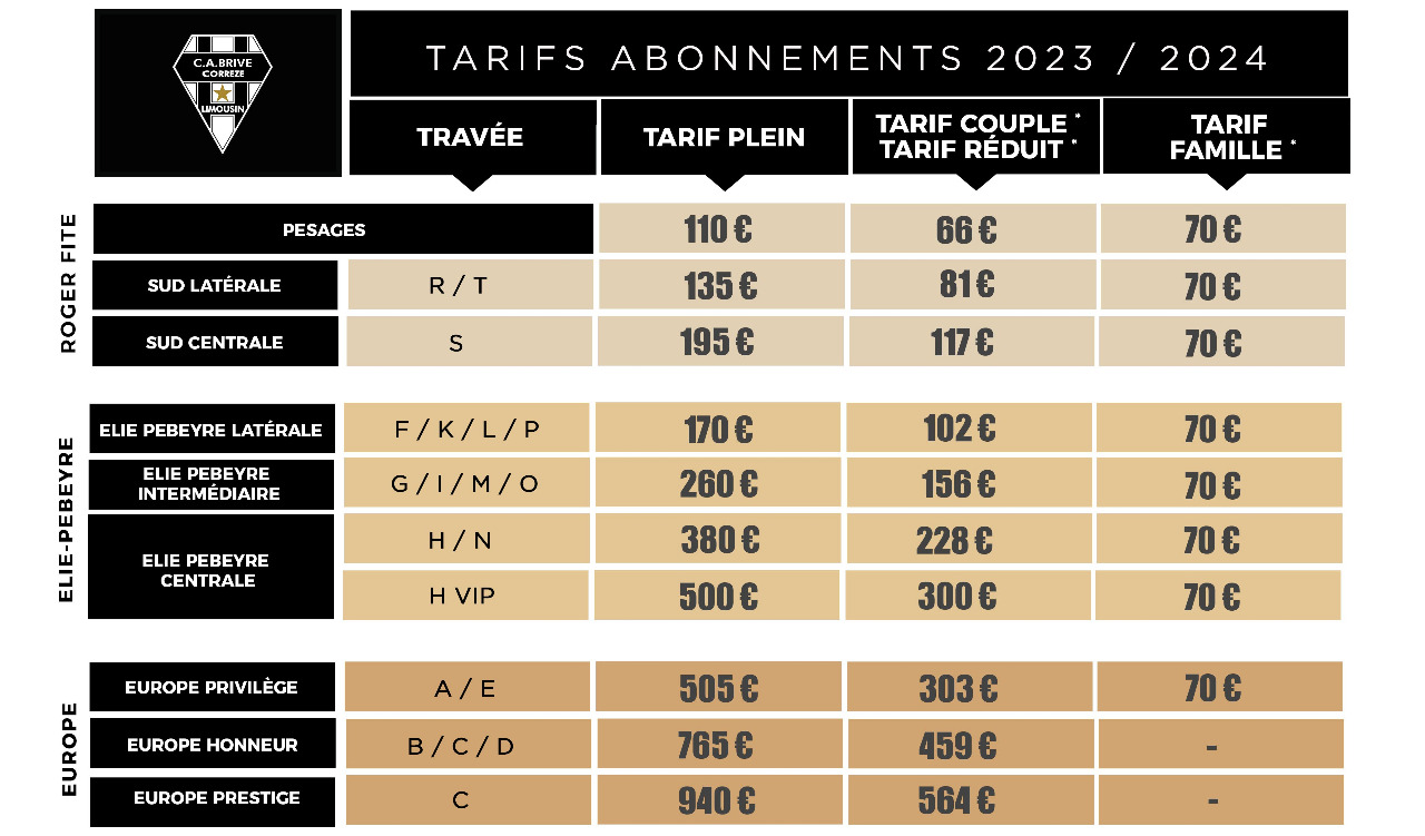 Pour cette campagne, forcément, les prix sont en baisse par rapport à ceux pratiqués en 2022/2023 pour le Top 14. La priorité de la place des abonnés est actée jusqu'au 16 juillet. Voici ce que vous propose le club briviste pour la saison 2023/2024 :