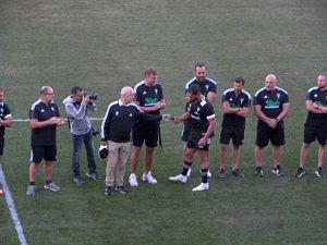 A la suite de l'entrainement, on passe tout de suite à la présentation. Cette fois, pas de discours de Simon Gillham, seulement un petit mot pour remercier le public d'être venu et surtout de le revoir à nouveau dans les gradins. Le président briviste présente le staff, en commençant par les adjoints. Si Jeremy Davidson, Jean-Baptiste Péjoine et Goderzi Shvelidze sont bien applaudis, Arnaud Méla en a peu plus !