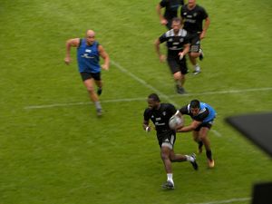 A mesure que la tribune de l'Europe se remplit, les joueurs enchainent les ateliers. Pendant que les 3/4 travaillent leurs combinaisons offensives, les avants travaillent la conquête. Pour finir cette bonne séance, une opposition grandeur nature qui voit chaque essai marqué applaudi par le public. Peceli Nacebe a réussi quelques beaux gestes techniques qui ont ravi les supporters. Après l'entrainment, place à la présentation de l'effectif.