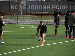 Les bonnets ont fait leur apparition en ce mardi matin avec une température fraiche malgré un soleil bien présent. Au retour de Toulouse, les joueurs ont dû se dire les choses pour éviter qu'un tel scénario se reproduise. Mais désormais, il faut arrêter de penser à Toulouse et se focaliser sur Lyon. Au moins, les matchs s'enchainent et vous avez moins le temps de cogiter. C'est parti pour l'entrainement avec à nouveau de nombreux Espoirs dont certains pourraient goûter pour la première fois à un match de Top 14. Enzo Hervé suspendu, Tedo Abzhandadze va récupérer le poste de titulaire et Tanguy Lacoste, l'ouvreur des Espoirs, se voit donc catapulter comme numéro 2 au poste. Comme à leur habitude, les entraineurs donnent de la voix pour faire passer les consignes durant les différentes phases de jeu et pour réveiller ceux qui commenceraient à s'assoupir. En test la semaine dernière, Dylan Lam est désormais intégré au groupe et prend ses marques. Quand on voit les enchainements offensifs et le peu de jeu au pied, on ne comprend pas pourquoi ce n'est pas possible de reproduire ceci le samedi durant les rencontres de Top 14 ? La séance collective se termine par un essai en solitaire de Vano Karkadze qui a fait rigoler tout le monde, lui compris ! Même si les résultats ne sont pas là, tout comme la manière, la bonne humeur est toujours présente dans le groupe.