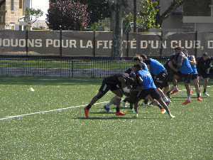 Cela aurait pu être une semaine plus tranquille ou en tout cas moins stressante. Sauf que la défaite à domicile face à Lyon maintient la pression sur les épaules du CAB. L'objectif est désormais simple et loin d'être le plus évident : faire un résultat à Perpignan, à minima ne pas perdre, dans l'idéal gagner. Mais pour obtenir ce résultat, il faut corriger tout ce qui s'est mal passé samedi. C'est donc reparti pour une semaine de préparation avant l'un des déplacements les plus importants de la saison. On repart également avec un groupe identique pour travailler. Un groupe qui fait de la place pour plusieurs Espoirs comme Francisco Coria Marchetti, Arthur Bruges, Sasha Gué, Tanguy Lacoste ou bien Kevin Fabien. Perpignan va proposer un autre style de jeu que Lyon mais cela va commencer par les bases, de belles montées défensives, de la discipline, de la conquête et des attaques tranchantes. Le staff n'hésite pas à reprendre et à corriger les joueurs quand cela ne va pas. Si tu ne le fais pas proprement à l'entrainement, tu ne le feras pas en match. Sous le soleil, les joueurs répètent les enchainements offensifs et défensifs avec de belles conclusions. Si Axel Muller et Kevin Fabien ont terminé blessés, pas de soucis majeurs à signaler dans le reste du groupe. Un groupe qui est parti travailler les mêlées pour les avants tandis que les trois buteurs de l'équipe, Stuart Olding, Enzo Hervé et Tedo Abzhandadze, ont fait leur séance de tirs aux but.