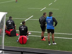 Cette préparation aurait été utile avant la réception de Pau. Sauf que pour samedi à Toulon, on prévoit du soleil dans la journée et une température autour des 19° en soirée. Mais la pluie en a décidé autrement ! Présente au début, elle s'est retirée au cours de la séance avant de revenir en force sur la fin. Dans ces conditions humides, il fallait encore plus de précision pour réussir les enchainements et ne pas faire tomber les ballons. Jeremy Davidson voit son groupe être renforcé par plusieurs joueurs blessés de longue date comme Esteban Abadie, Pietro Ceccarelli et Andrés Zafra. En compagnie de Lucas Paulos, les 4 joueurs espèrent enfin commencer leur saison et prendre le train briviste en marche. Après des déconvenues à Montpellier et Bordeaux, Brive va tenter de débloquer le compteur à Toulon et y travaille pour. Les entraineurs donnent de la voix pour corriger les erreurs et faire que cela se rapproche de la perfection à l'entrainement. A l'issue de la séance collective, séance atelier un peu plus poussée que d'habitude avec les avants chez le duo Arnaud Méla / Goderzi Shvelidze et les 3/4 chez Jean-Baptiste Péjoine.