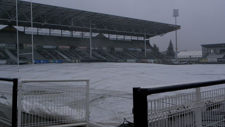 Pendant que les joueurs s'entrainaient, les agents muninipaux ont dressé la bache pour protéger la pelouse d'Amédée Domenech de la pluie prévue ces prochains jours.