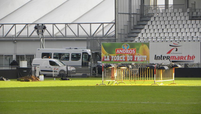 Tandis que les joueurs s'entrainaient (comme d'habitude) sur le terrain annexe, il y avait de l'animation sur le terrain d'honneur. Un peu de photothérapie pour le centre du terrain mais pourquoi il y a des trous au niveau des 22 ? Julien Brugnaut nous a donné l'explication (à prendre au second degré bien évidemment !) : il y a des fouilles archéologiques sur la pelouse du Stadium !