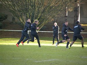 Tandis que les joueurs s'entrainaient (comme d'habitude) sur le terrain annexe, il y avait de l'animation sur le terrain d'honneur. Un peu de photothérapie pour le centre du terrain mais pourquoi il y a des trous au niveau des 22 ? Julien Brugnaut nous a donné l'explication (à prendre au second degré bien évidemment !) : il y a des fouilles archéologiques sur la pelouse du Stadium !