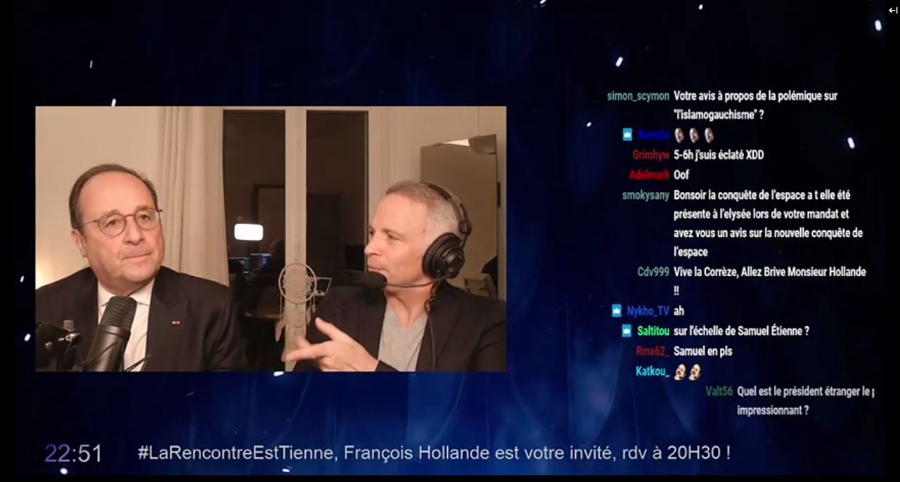 Depuis quelques temps, Samuel Etienne a lancé sa chaine sur Twitch et compte beaucoup d'abonnés (plus de 300 000 abonnés). Traditionnellement plateforme pour les jeux vidéos, le présentateur de Questions pour un Champion bouscule un peu les habitudes et traite de l'actualité. Ce lundi, il lançait #LaRencontreEstTienne, le concept : un invité et on répond aux questions posées en direct. Premier invité : François Hollande. On peut dire que cela a bien marché avec près de 700 000 visionnages à ce jour.