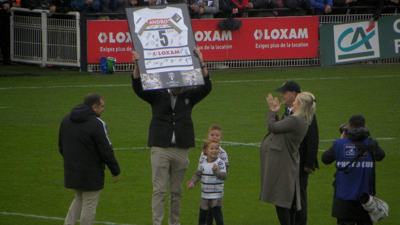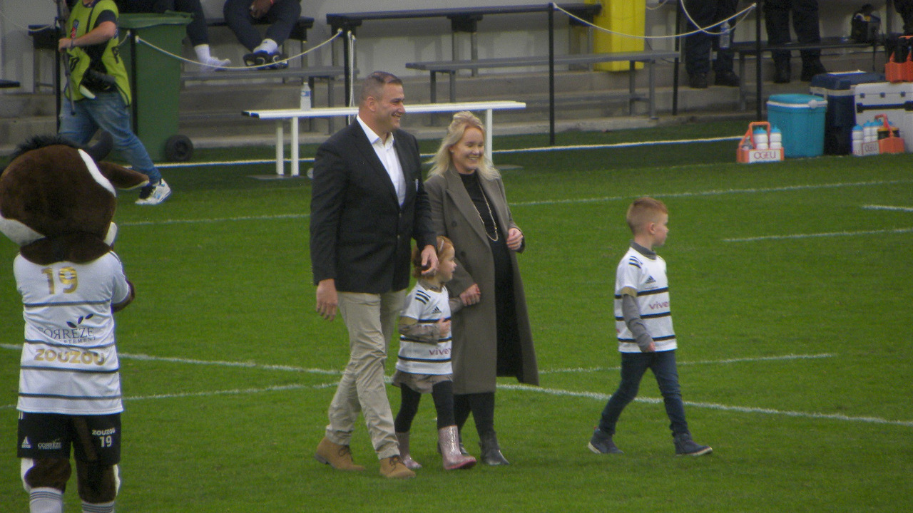 Samedi, à la mi-temps du match entre Brive et Bayonne, c'était l'occasion de faire ses adieux au Stadium et au public briviste. En compagnie de sa femme Sian et de ses deux enfants Harvey et Kenzie, Mitch Lees a reçu de Xavier Ric et Simon Gillham son maillot dédicacé par toute l'équipe et floqué avec son numéro 5. L'occasion d'un petit discours en français (il aurait sûrement voulu le faire en anglais pour être plus à l'aise !) pour remercier tout le monde au club, les supporters et toutes les personnes qui ont rendu cette étape briviste positive et joyeuse.