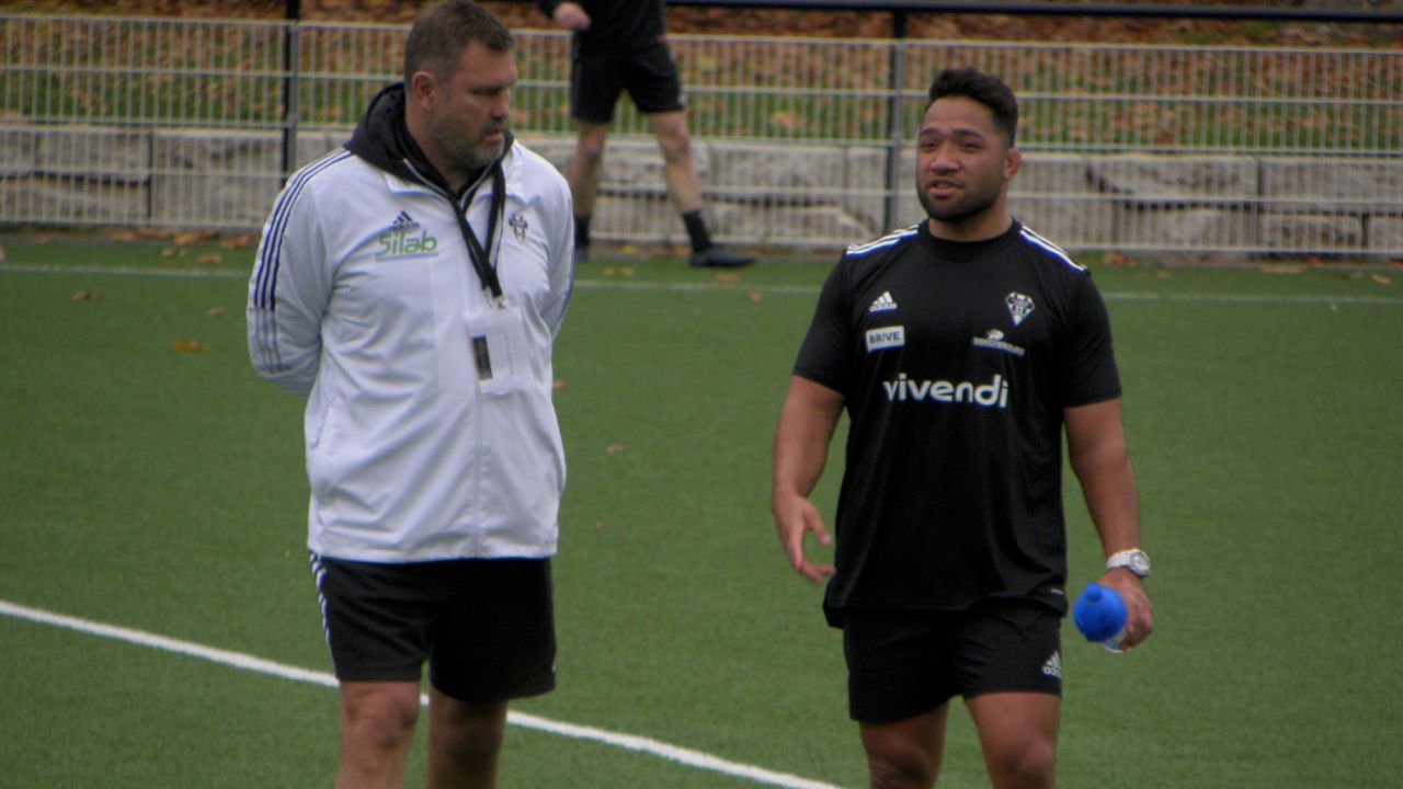 Après un travail physique en marge du groupe, Motu Matu'u échange avec Jeremy Davidson avant d'assister à la fin de la séance depuis le bord du terrain.