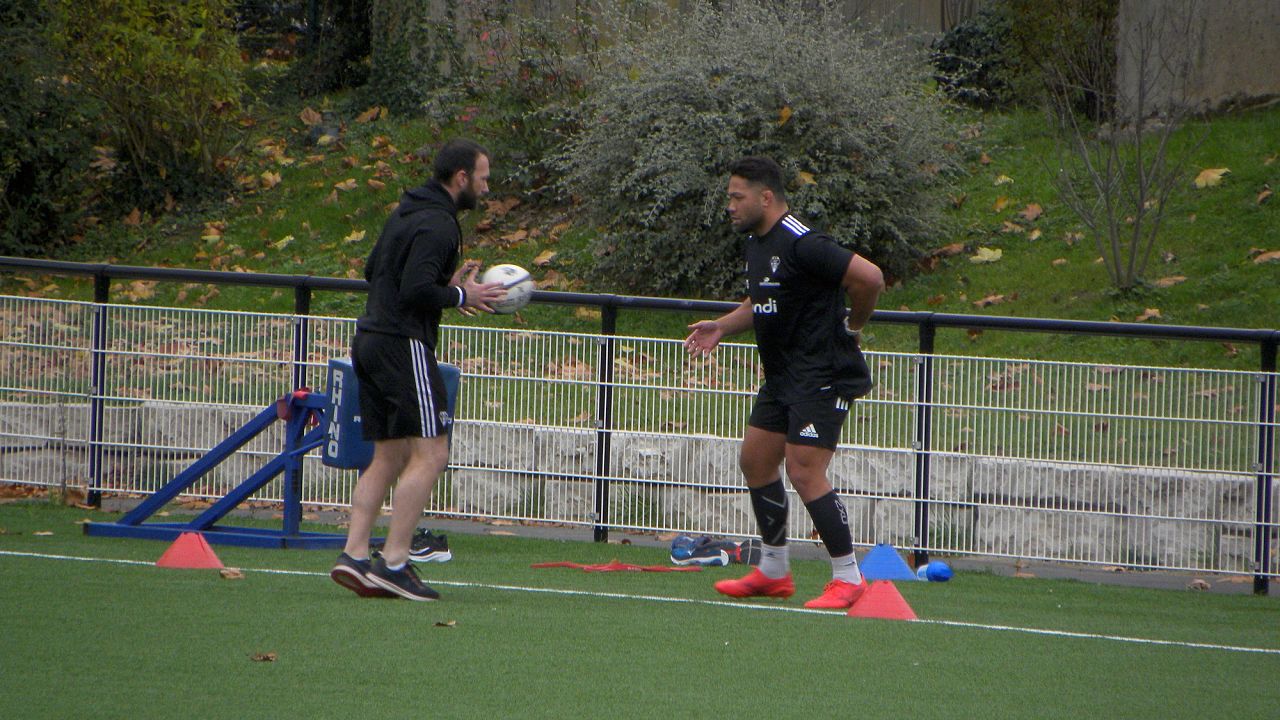 Pour un talonneur, le plus dur est de mémoriser les combinaisons en touche et trouver la synchronisation avec ses sauteurs. Quoi de mieux qu'un atelier touche pour s'habituer à son nouvel espace de travail. En compagnie de Thomas Acquier et du capitaine de touche Matthieu Voisin, Matu'u alterne avec son coéquipier sur les différentes combinaisons.