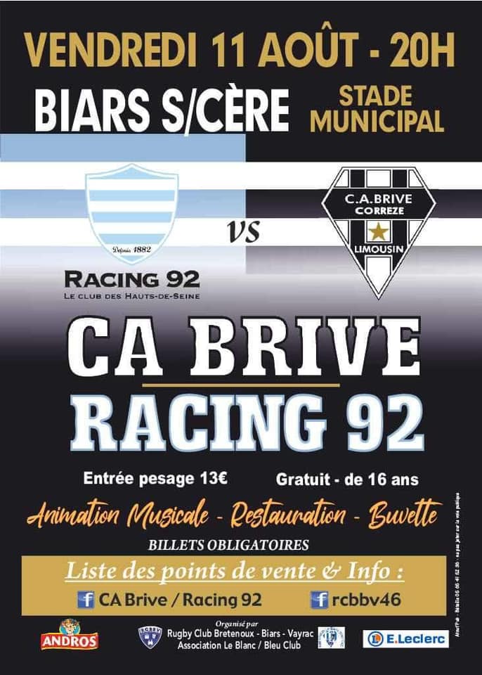Voici les équipes de Brive et du Racing 92 pour cette rencontre amicale :