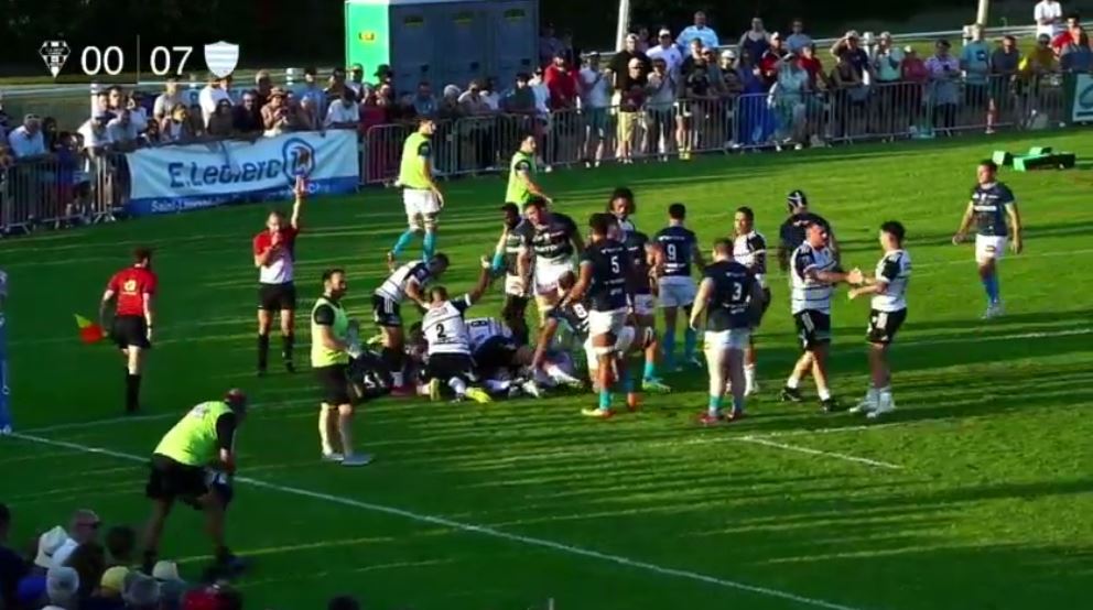 Alors qu'on arrive à la pause fraicheur au milieu de cette première période, Daniel Brennan est touché à la cheville et cède sa place à Wesley Tapueluelu (20'). Le jeu reprend et Brive continue de développer ses attaques. Jackson Garden-Bachop distribue bien le jeu à la main et au pied même si ça manque quelque peu de variation et changements de rythme. Si Esteban Abadie est parti, le contre en touche fonctionne toujours. Sasha Gué vole un ballon et Brive arrive rapidement dans les 22 du Racing. Paula Walisoliso avance en puissance et est difficilement mis à terre à quelques mètres de l'en-but. Le jeu rebondit rapidement vers l'aile de Noé Bros qui aplatit en coin (10-7, 26').