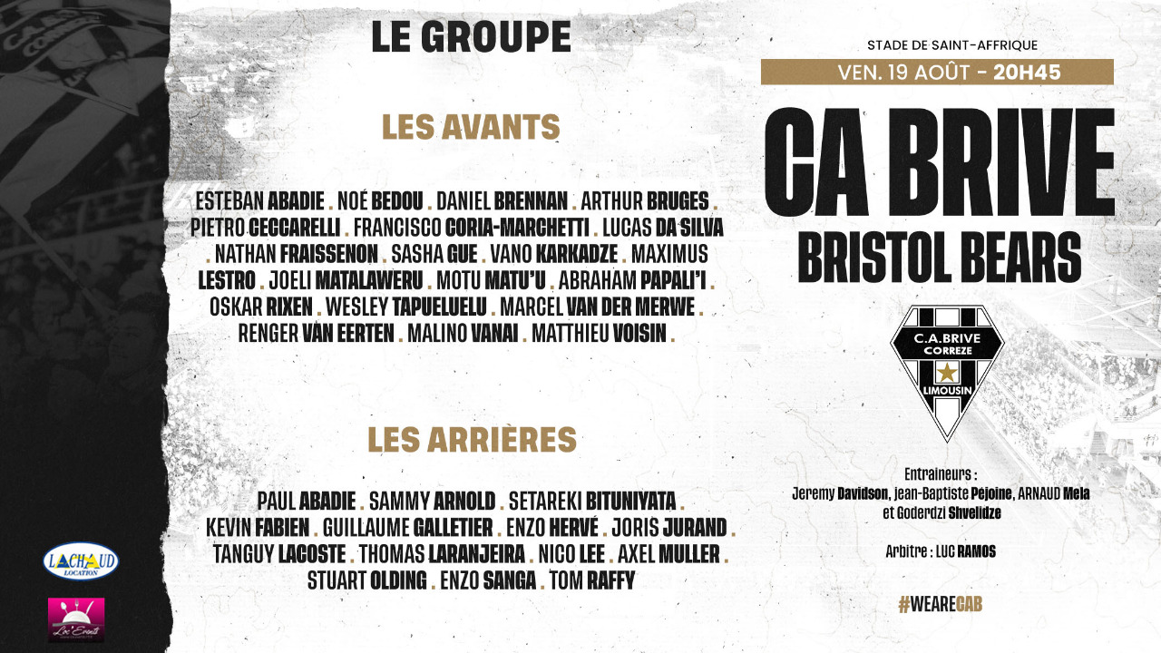 Avant de débuter le Top 14 face à Lyon, Brive a programmé deux matchs amicaux. Avant la rencontre face au Racing 92 à Terrasson la semaine prochaine, le CAB dispute le Challenge Armand Vaquerin du côté de Saint-Affrique. Ce vendredi, à 20h45, Brive reçoit Bristol. L'arbitre de la rencontre sera Luc Ramos.