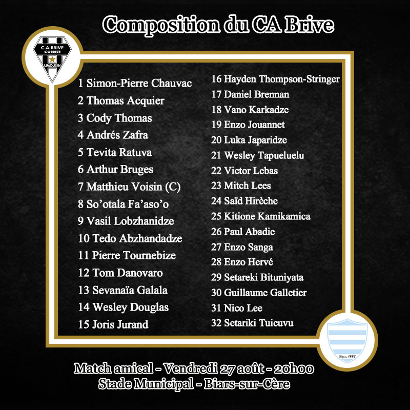 Pour recevoir le Racing 92, Brive doit toujours composer avec une infirmerie bien remplie mais qui petit à petit se vide (Giorgadze, Tirefort, E.Abadie, Laranjeira, Paulos, Ceccarelli, Marais, Muller, Dufour, Darthou, Cerqueira absents). Mais il y a des retours pour ce dernier match amical avec les premières pour Tevita Ratuva et Paul Abadie et les retours de Mitch Lees, Kitione Kamikamica, Setareki Bituniyata, Vasil Lobzhanidze, Tedo Abzhandadze ou encore Setariki Tuicuvu.