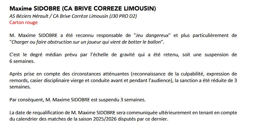Après passage devant la commission de discipline, Maxime Sidobre écope d'une suspension de 6 semaines pour jeu dangereux, réduite à 3. Il va ainsi manquer la phase finale et en fonction du parcours du club, il restera peut être des matchs à purger la saison prochaine.