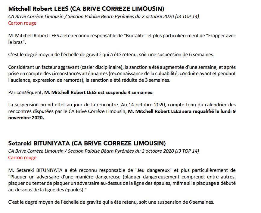 Expulsé en fin de première période, Mitch Lees écope de 7 semaines de suspension (6+1 avec son casier) mais réduite à 4 pour brutalité (frapper avec le bras). Le 2e ligne va manquer les réceptions de Toulouse et Clermont ainsi que les déplacements à Montpellier et Toulon. Il fera son retour pour la réception du Racing 92.