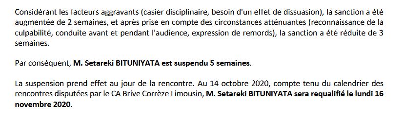 Expulsé en début de seconde période, Setareki Bituniyata écope de 8 semaines de suspension (6+2 avec son casier) mais réduite à 5 pour jeu dangereux (plaquer un adversaire d'une manière dangereuse). L'ailier va manquer les réceptions de Toulouse, Clermont et du Racing 92 ainsi que les déplacements à Montpellier et Toulon. Il fera son retour pour le déplacement à La Rochelle.
