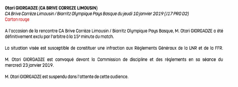 Giorgadze va manquer le déplacement à Angoulême et plus à venir. La semaine prochaine, on saura combien de matchs manquera le 3e ligne briviste.