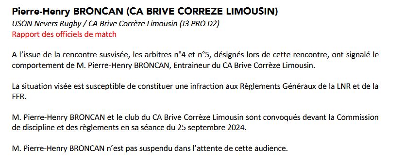 Mercredi prochain, Pierre-Henry Broncan va passer en commission de discipline et recevoir sa sanction. Il ne sera pas suspendu pour la réception d'Aurillac vendredi soir.