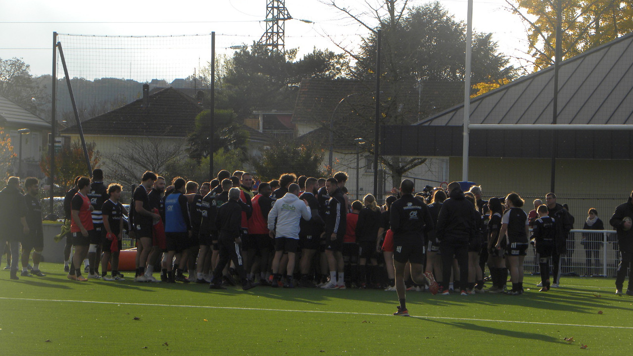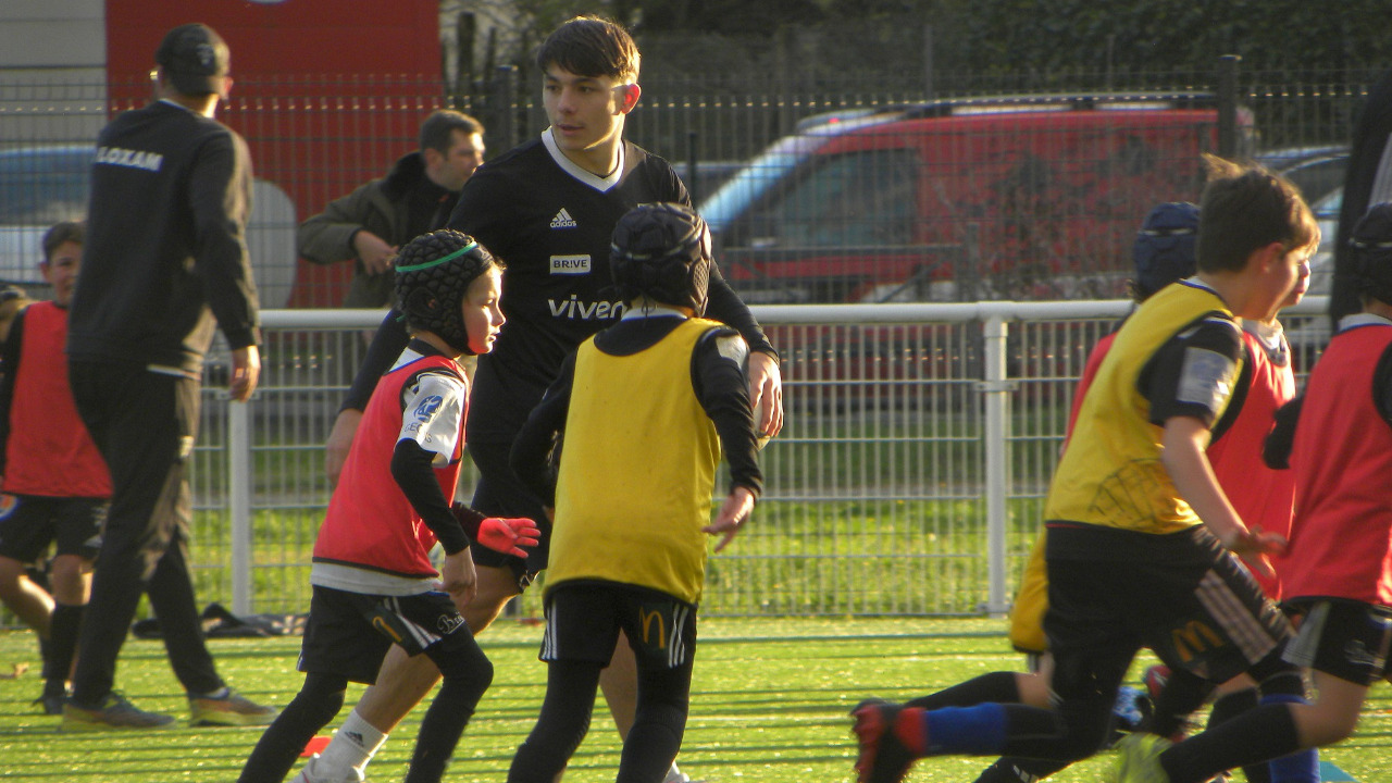 Mais effectuer cet entrainement un mercredi après-midi, aux Bouriottes, avait également un autre objectif : offrir la possibilité aux enfants de l'école de rugby d'assister à l'entrainement et à la fin de l'entrainement des grands, pouvoir être entrainé par eux ! La classe ! Les joueurs se sont donc partagés à travers l'ensemble des terrains de la plaine et à travers les différentes catégories d'âge. Marrant de voir Teun Karst, presque 2 mètres et tout juste sacré champion d'Europe U20 avec les Pays-Bas (félicitations Teun !), animer l'atelier avec des enfants bien plus petits que lui. Ou pour les plus grands avoir des cours de tirs au but donnés par Thomas Laranjeira. A tous les niveaux, les enfants ont du apprécier et espèrent revivre cette expérience au cours de la saison (plus vraisemblablement en 2024).