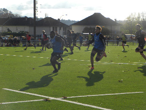 Un entrainement "délocalisé" aux Bouriottes pour la bonne cause. PHB ne va pas tout révolutionner car pour lui, avant tout, ça reste une prise de contact et une évaluation du matériel à sa disposition. Pour l'occasion, on a droit à un groupe très élargi puisque les Séniors et les Espoirs sont réunis. Ce qui fait qu'il y a du monde sur le terrain. Le gros groupe est divisé en 4 mini groupes qui s'interchangent au cours de la séance en opposition. Lundi, dans sa conférence de presse, le nouveau manager a annoncé vouloir mettre plus de concurrence dans le groupe. C'est l'occasion pour certains de sortir de la cave et remonter dans la hiérarchie. On peut penser par exemple à Sammy Arnold, Jackson Garden-Bachop ou bien Mathieu Brignonen, sans oublier les Espoirs qui auront leur mot à dire dans l'opération "JIFF" que va désormais devoir mener à partir de Mont de Marsan.
