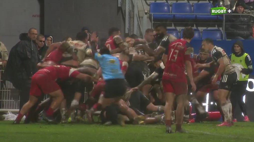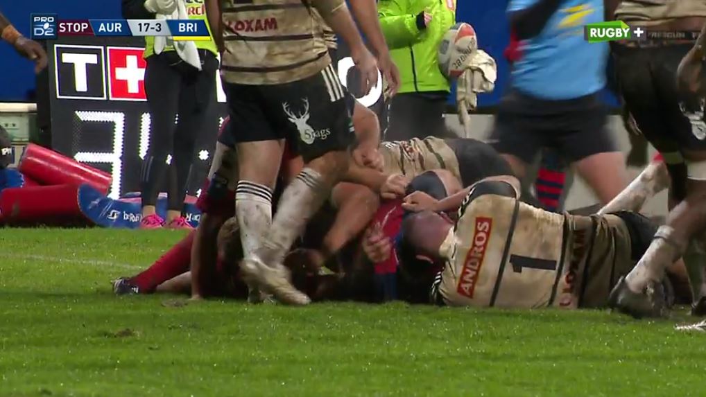 Cet essai vient récompenser la domination aurillacoise dans cette première période. La fin de période est confuse avec un Brive toujours dans son camp et qui concède une dernière pénalité par Ross Moriarty. D'abord alertée par son arbitre de touche, Mme Groizeleau sanctionne le numéro 8 briviste pour un raffût dangereux mais elle est appelée par son arbitre vidéo pour voir l'action et annuler justement cette pénalité. On repart donc sur une mêlée, Brive sort le ballon et tape en touche. La pause ne peut faire que du bien à Brive, dominé dans l'énergie et les impacts par une équipe d'Aurillac, bien décidée à s'offrir le derby.