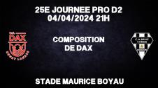 Pour Dax : 1 Lolohea - 2 Delonca - 3 Ferreira - 4 Ferrer - 5 Singer - 6 Barrère (Cap) - 7 Nacika - 8 Wasley - 9 Ravier - 10 Cerisier - 11 Naseara - 12 Bolakoro - 13 Daguerre - 14 Gatelier - 15 Duprat