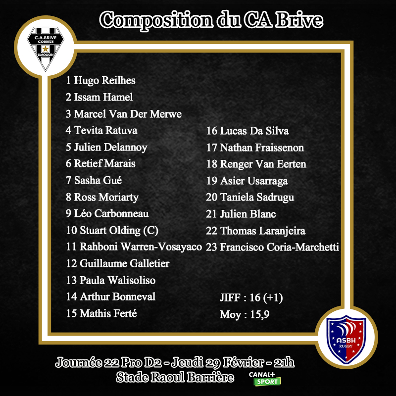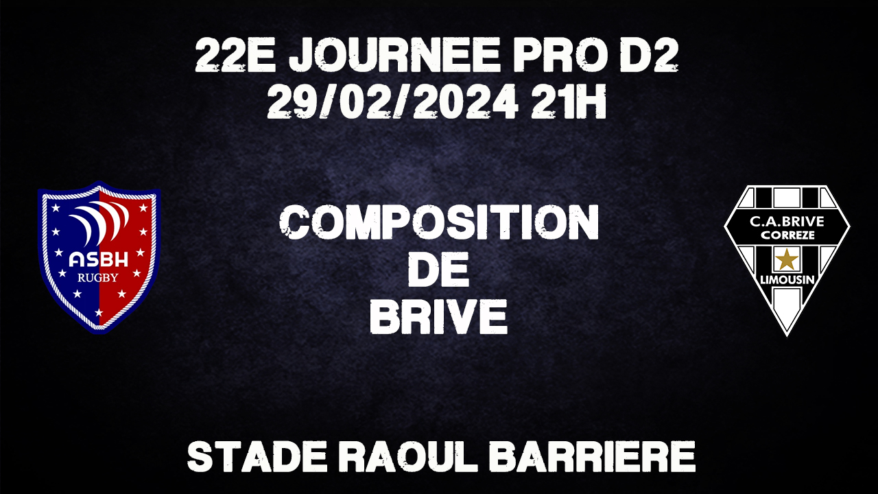Pour ce déplacement, Brive modifie ses lignes avec encore des joueurs qui changent de postes. Issam Hamel et Marcel Van der Merwe sont de nouveau titulaires en première ligne. Tout comme Julien Delannoy en 2e ligne. Retief Marais retrouve la 3e ligne. Stuart Olding forme la charnière avec Léo Carbonneau. Guillaume Galletier est titulaire au centre. Tandis que Mathis Ferté bascule à l'arrière, c'est Rahboni Warren-Vosayaco qui sera à l'aile, une première pour lui.