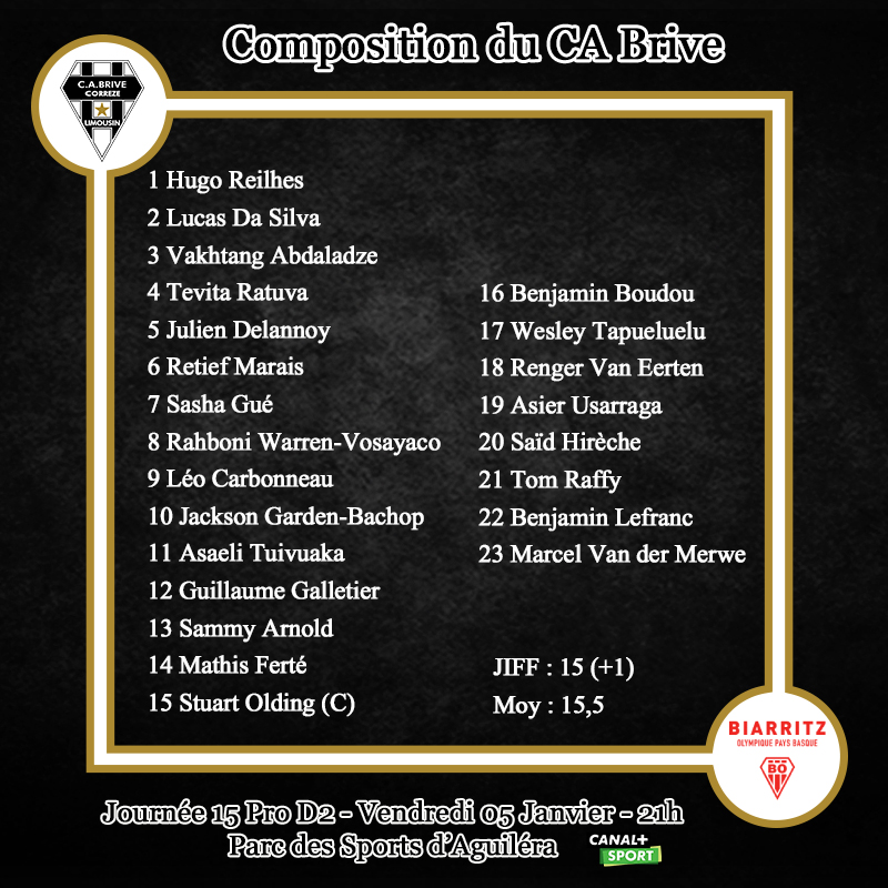 Pour ce déplacement, Brive aligne plusieurs joueurs sur le retour. Vakhtang Abdaladze retrouve la titularisation à droite de la première ligne. Commotionné à Colomiers, Julien Delannoy est de retour en 2e ligne. Retief Marais et Sasha Gué encadrent Rahboni Warren-Vosayaco en 3e ligne. Plus vu depuis Dax, Jackson Garden-Bachop revient dans le groupe et sera l'ouvreur titulaire. Asaeli Tuivuaka est titulaire à l'aile. A noter les premières apparitions dans le groupe de Benjamin Boudou et Asier Usarraga.