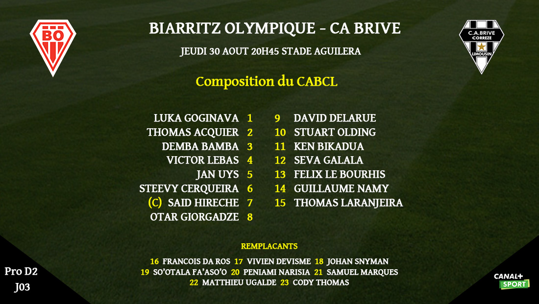 Voici le XV de départ du CA Brive pour le déplacement à Biarritz :