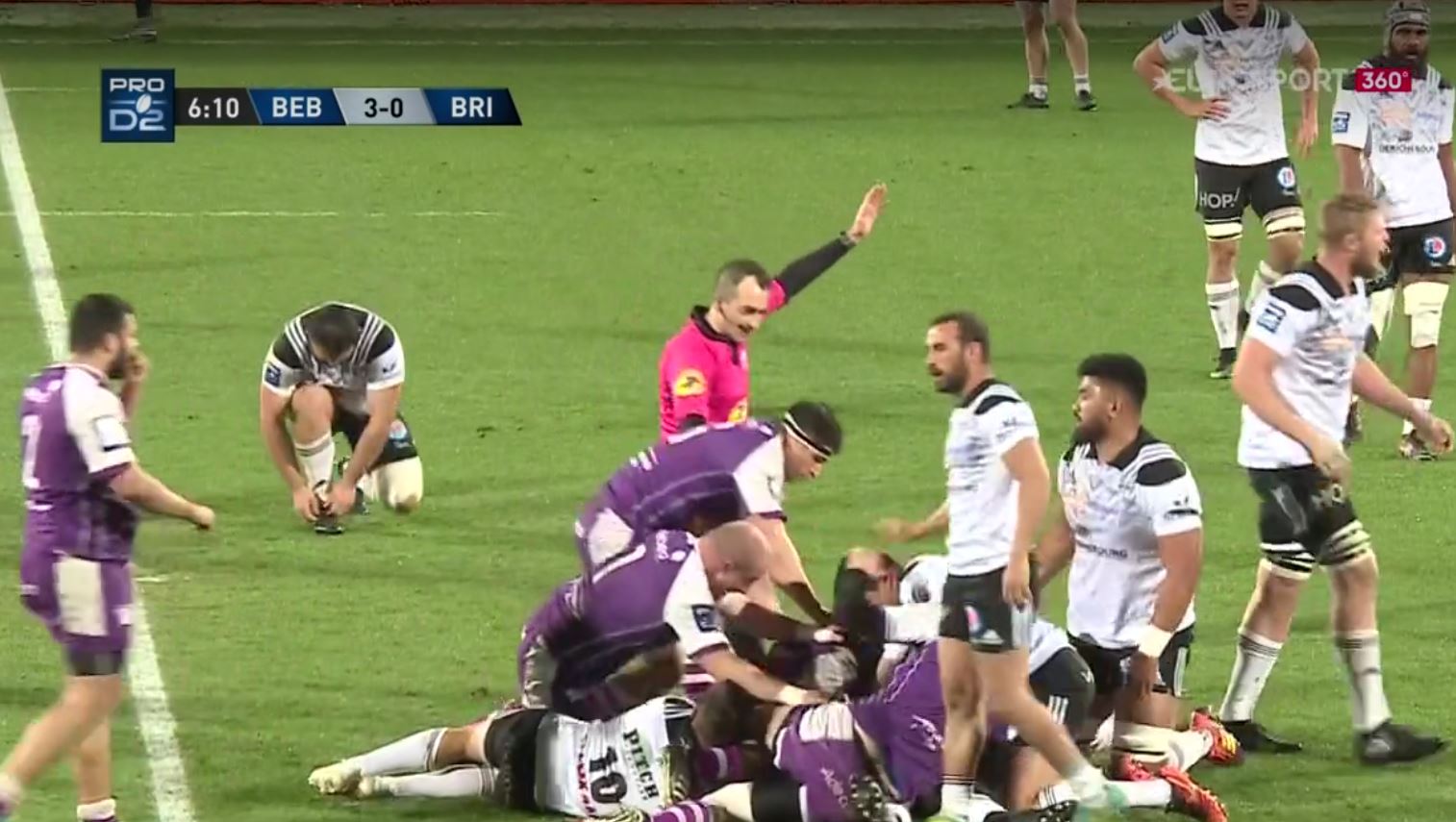 Brive est reparti à la conquête et les bressans se mettent à la faute. Pénalité pour Brive, Olding tape en touche à 5 mètres. Un maul est de nouveau formé et essai de Brive de So’otala Fa'aso'o en force. (57’). Thomas Laranjeira transforme, 23-24 (58’), c’est un 100% pour Laranjeira ! On repasse devant au score, mais l’ambiance est lourde.
