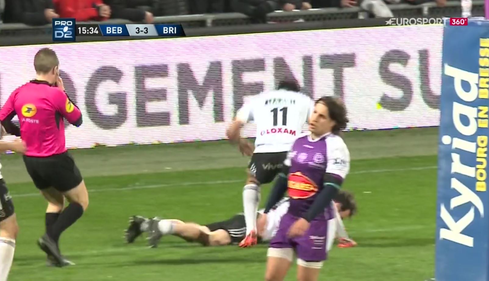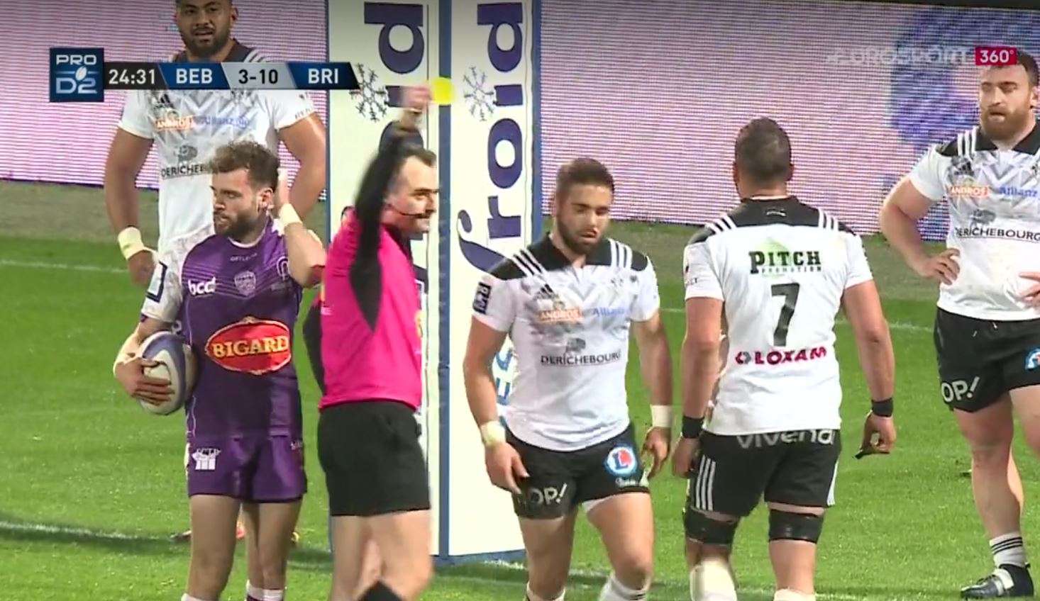 Mais Bourg décide de revenir à la conquête et arrive jusqu’aux 22 mètres brivistes. On entend que c’est une bataille défensive pour les brivistes. On serre les points. Bourg est menaçant ... Ils sont sur les 5 mètres … et l’arbitre arrête l’action. Sans images, on se détend un peu et nouveau coup sur la tête. Carton jaune pour Enzo Hervé pour apparemment un plaquage haut (24’). Hervé à son tour est prié de rejoindre le banc de touche, Brive est de nouveau à 14.