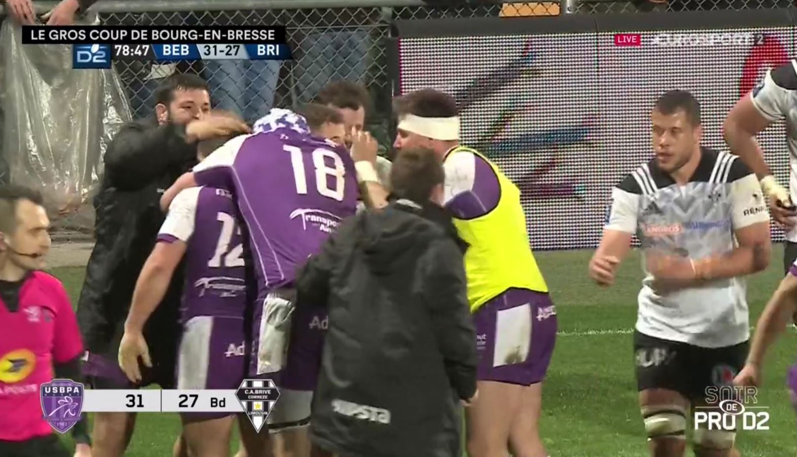 Brive hérite d'une pénalité suite à un ballon porté écroulé (72’). Pénaltouche, charge des brivistes, les bressans résistent tant bien que mal jusqu’à commettre une faute. Pénalité et 3 points que Thomas Laranjeira apporte à Brive 26-27 (75’).