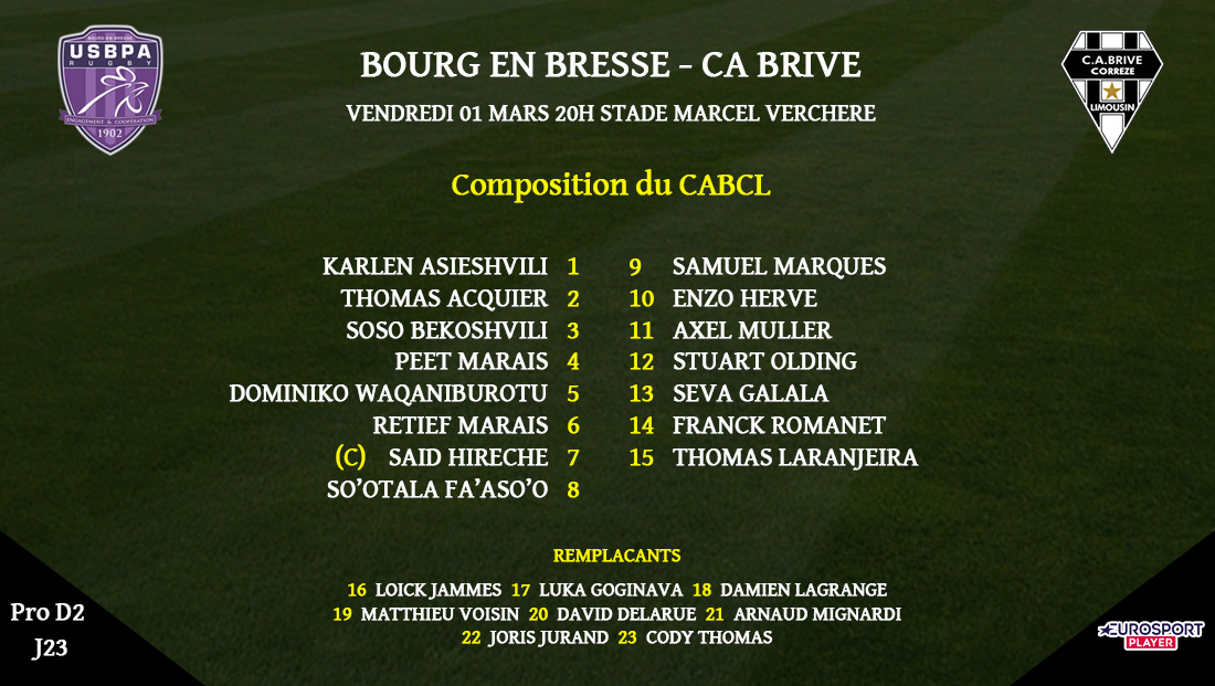Voici le XV de départ du CA Brive pour le déplacement à Bourg en Bresse :