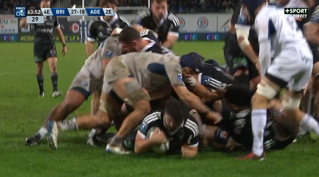 Brive ne perd pas de temps dans cette rencontre pour prendre la tête. Agen se met à la faute devant et voilà Brive positionné à 5 mètres avec une touche. On sent venir la combinaison classique et elle arrive ! Issam Hamel trouve Retief Marais, le maul se forme et c'est Simon-Pierre Chauvac qui marque (7-0, 5').