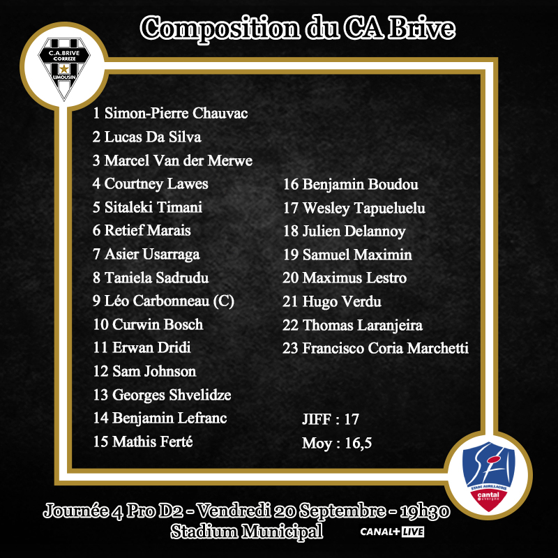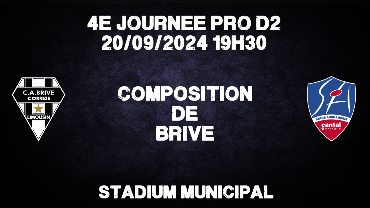 Pour cette réception, Brive retrouve la majorité de ses cadres, laissés au repos à Nevers. Simon-Pierre Chauvac est de retour comme titulaire en première ligne. Le duo Courtney Lawes - Sitaleki Timani forme la deuxième ligne. Nouveau trio en 3e ligne avec Retief Marais, Asier Usarraga et Taniela Sadrugu. Touché à l'entrainement lundi, Léo Carbonneau est là et forme la charnière avec Curwin Bosch. Sam Johnson retrouve son numéro 12. Benjamin Lefranc et Erwan Dridi sont placés aux ailes, décalant Mathis Ferté à l'arrière. A noter la première feuille de match pour Maximus Lestro.