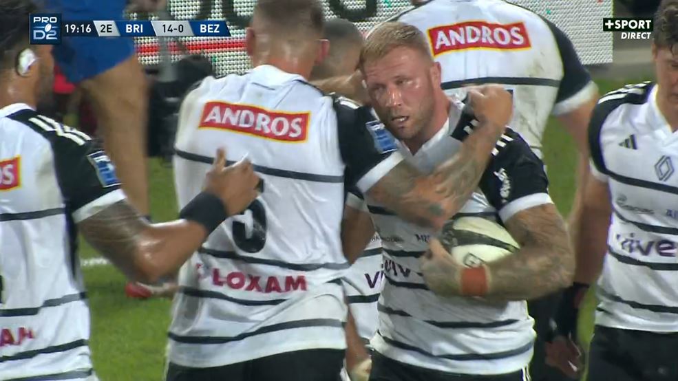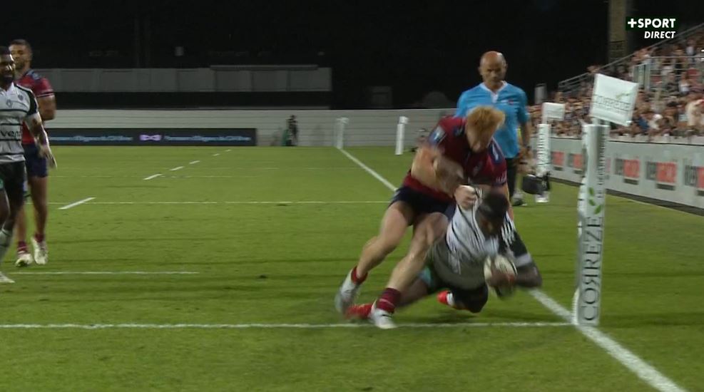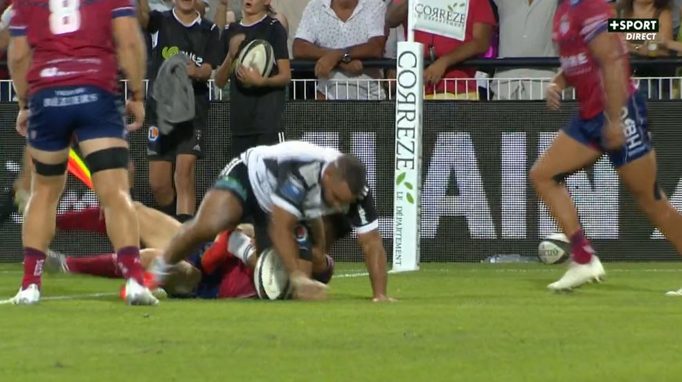 Cet excellent début de rencontre est contrarié par la sortie sur commotion de Wesley Tapueluelu (4'). S'il utilise souvent le jeu au pied, Jackson Garden-Bachop se trompe cette fois-ci avec un jeu au pied qui termine en ballon mort. Béziers en profite pour se lancer à l'attaque dans le camp briviste. L'attaque parvient à gagner des duels et à se rapprocher des 22 mètres. Gabin Lorrée tente de déborder mais Stuart Olding et Arthur Bonneval sont là au plaquage. Au contact, le biterrois perd le ballon qui arrive dans les bras de Paula Walisoliso. Profitant d'une incompréhension générale, il part petit côté, tape à suivre pour ... lui même et s'en va marquer son essai 80 mètres plus loin (14-0, 8').