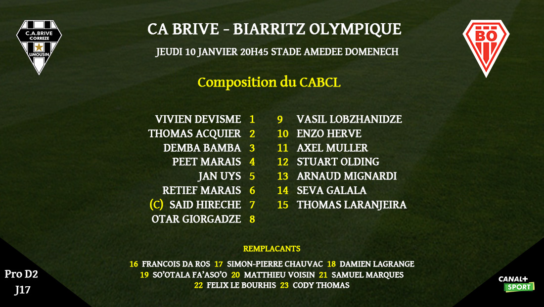 Pour cette réception, Brive effectue plusieurs changements avec notamment les retours de François Da Ros, Jan Uys, Saïd Hirèche et Arnaud Mignardi comme titulaires. Première titularisation pour Axel Muller. Touché lundi matin, So'otala Fa'aso'o tient sa place et sera remplaçant.