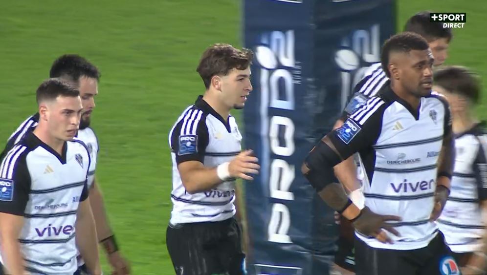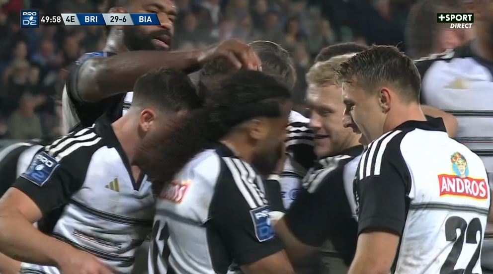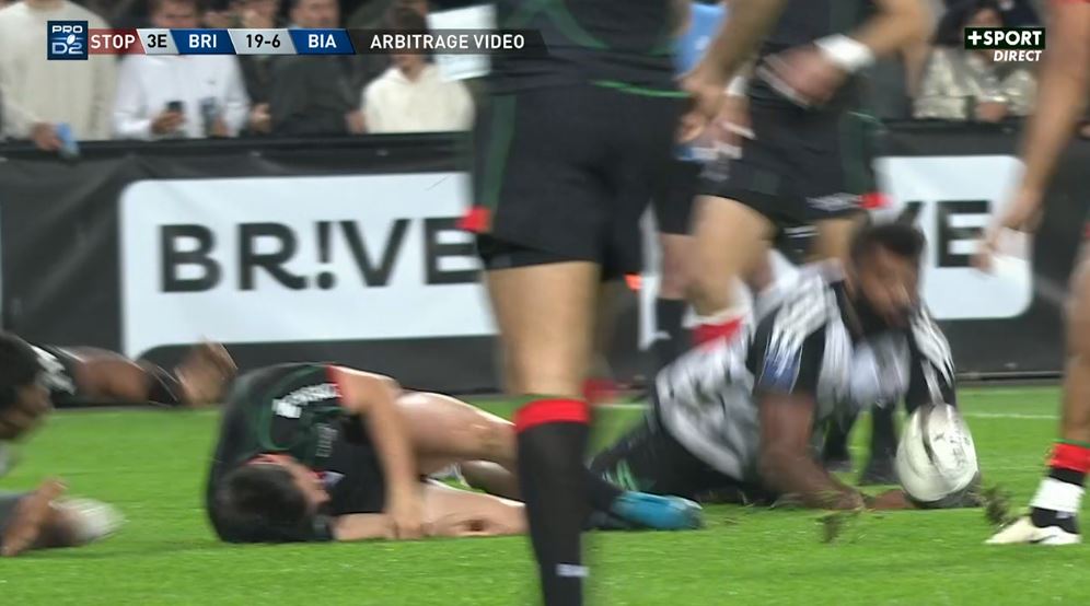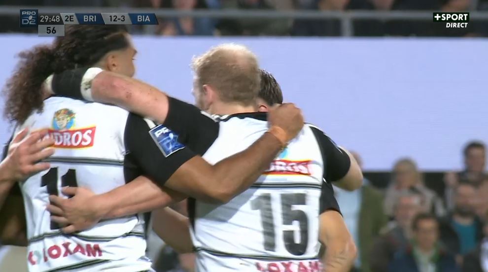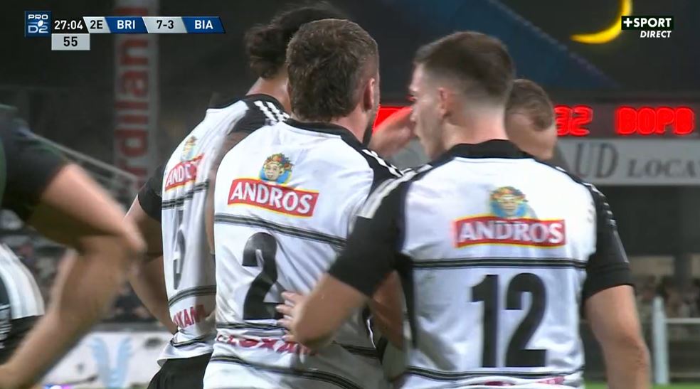 Pas le temps de souffler qu'il faut déjà se relever de son siège ! Taniela Sadrugu gratte un ballon au sol, Stuart Olding joue au pied dans le dos de la défense. Erwan Dridi se présente, s'amène la balle avec une aile de pigeon qui rebondit sur Arthur Bonneval. L'ailier briviste s'en va marquer malgré le retour d'un défenseur biarrot (19-3, 31').
