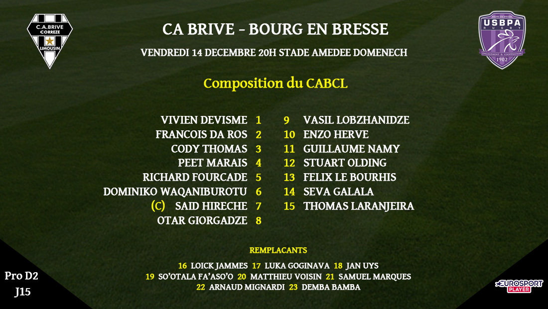 Pour cette réception, Brive effectue 7 changements par rapport à Provence. Première titularisation de la saison pour Richard Fourcade tandis que Cody Thomas, Dominiko Waqaniburotu, Otar Giorgadze, Vasil Lobzhanidze, Enzo Hervé et Guillaume Namy retrouvent le statut de titulaire.