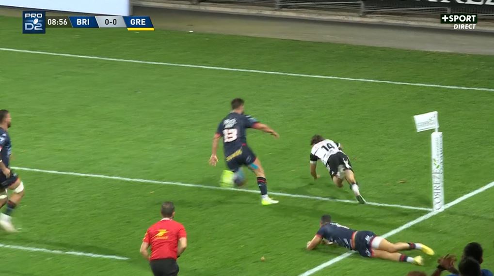 Brive s'est donné comme objectif de bien commencer la rencontre et ainsi mettre la pression sur Grenoble. Les premières actions ne confirment pas cet objectif avec une incompréhension entre Thomas Laranjeira et Arthur Bonneval puis en pas assez propre en défense sur la première action grenobloise. En premier, c'est Grenoble qui va perdre ses nerfs avec le mauvais plaquage à retardement de Brandon Nansen sur Sam Johnson. L'ancien briviste s'explique avec Ross Moriarty, le début d'une grande amitié entre les deux et plus globalement entre les deux équipes. Mr Beun adresse le carton jaune au 2e ligne grenoblois (5'). Sur l'acition, Brive n'en profite pas, tombat dans les bras du grattage grenoblois. Sur l'action, Paula Walisoliso se blesse à la cheville et doigt céder sa place (6'). Brive tient le ballon dans la moitié, les avants avancent en puissance mais la défense du FCG est bien regroupée dans l'axe. Sauf que les ailes sont plus dégarnies en conséquence. Après plusieurs allers-retours, la faille est trouvée pour concrétiser une longue possession. Le ballon arrive vite sur l'aile, Sam Johnson ne perd pas de temps pour décaler Mathis Ferté qui termine en coin (7-0, 10').