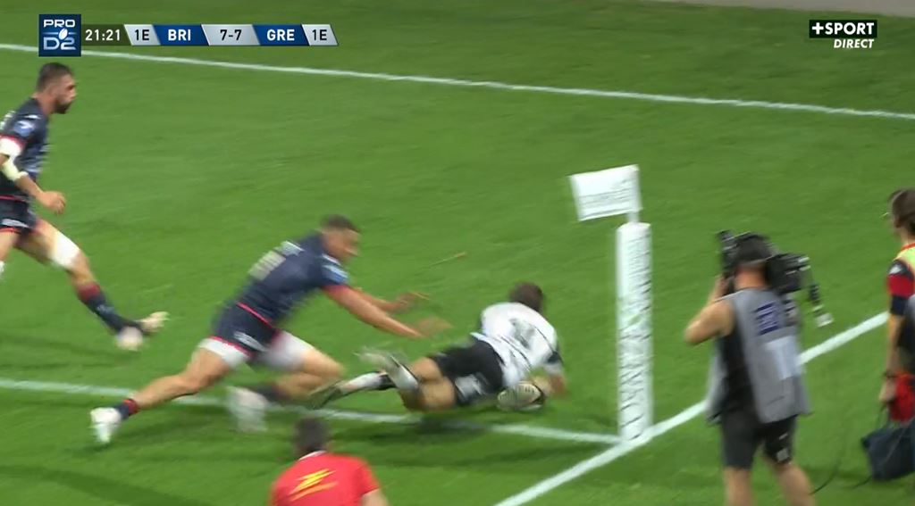 Mais la réponse grenobloise ne va pas tarder. Sam Davies feinte la passe et accélère entre Issam Hamel et Sitaleki Timani. L'ouvreur gallois ne sera pas rattrapé et égalise (7-7, 15'). Tout est à refaire pour les brivistes qui insistent en attaque mais sont en retard sur les soutiens et se font pénaliser. Ferté, sur son aile, joue au pied et met l'arrière garde grenobloise sous pression. Steeve Blanc-Mappaz veut jouer rapidement le renvoi d'en-but sauf que cela ne fait la distance minimale requise. Mêlée à 5 mètres pour Brive. Après une première pénalité, on repart sur une nouvelle mêlée. Derrière celle-ci, la combinaison est parfaite : Carbonneau pour Johnson pour Olding pour Laranjeira et pour Ferté qui inscirt son doublé (12-7, 23').
