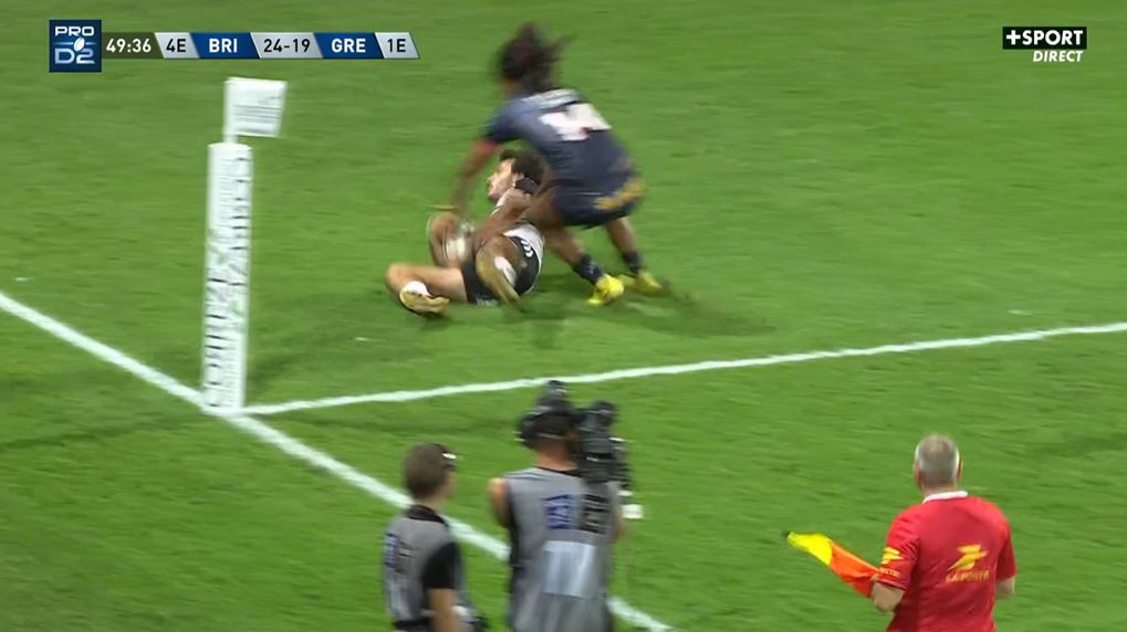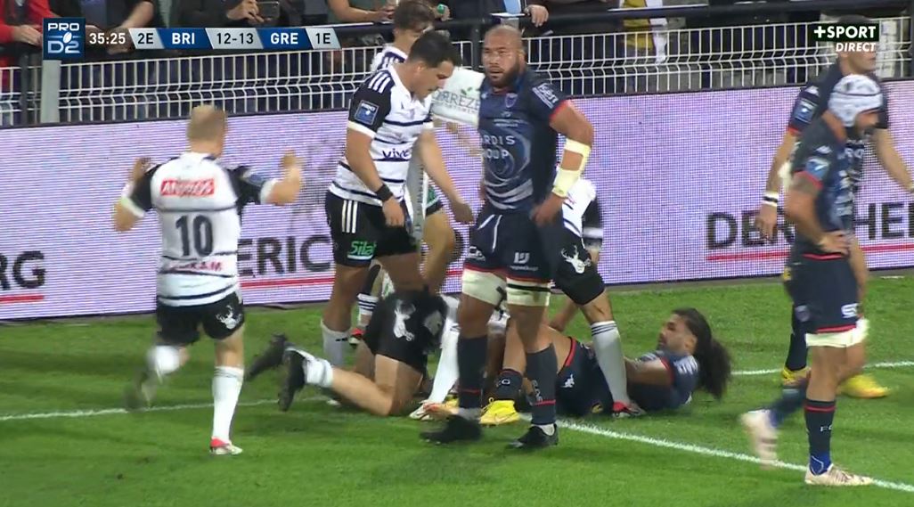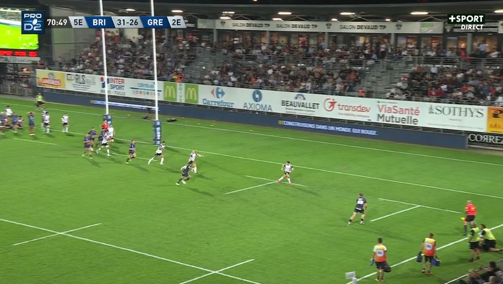 Comme avant, Brive se met encore en difficulté en perdant trop facilement le ballon sur le renvoi. Et voilà Grenoble avec la dernière munition. Une dernière munition qui se transforme en pénalité en raison d'une mauvais attitude au sol de Rahboni Warren-Vosayaco. Davies passe la pénalité et Grenoble est au contact à la pause (17-16, 40'). Malgré trois essais marqués, Brive ne parvient pas à détacher Grenoble au score qui parvient à maximiser chaque opportunité dans le camp briviste.