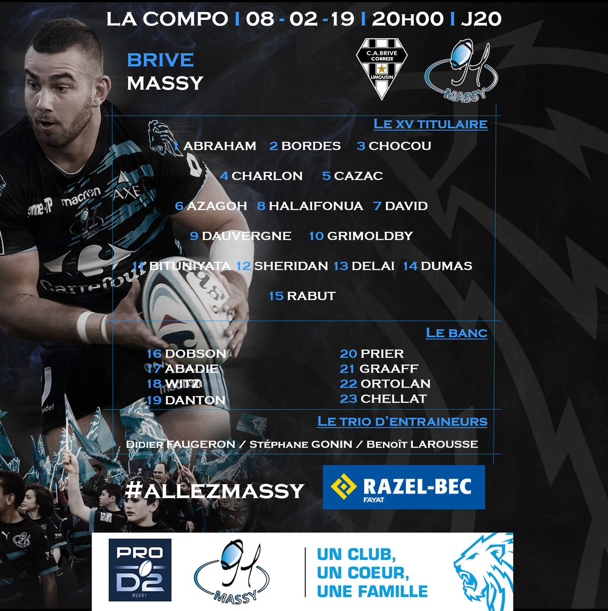 Voici le XV de départ de Massy pour le déplacement à Brive :